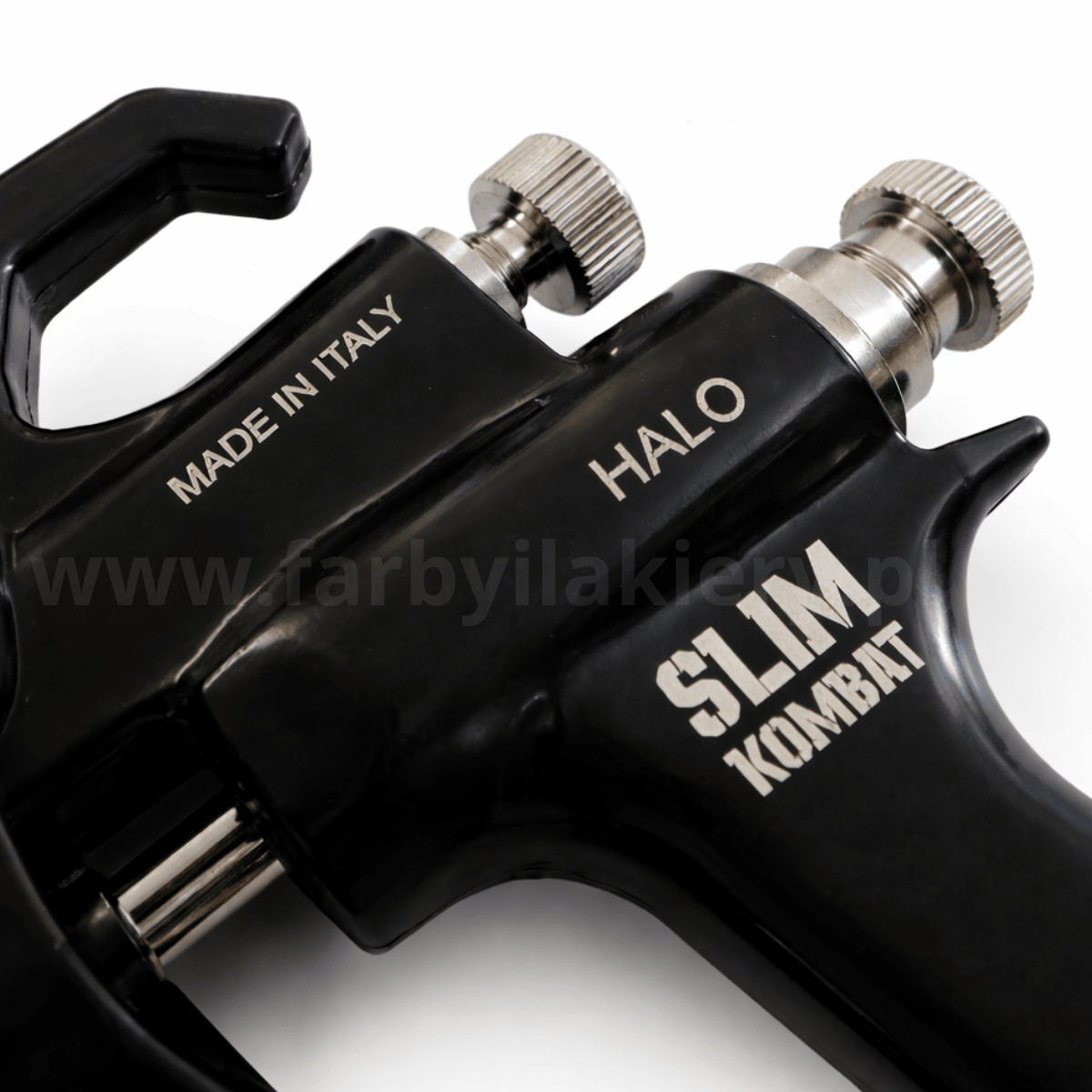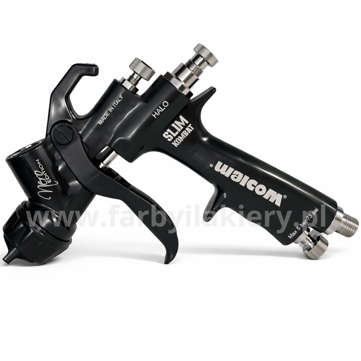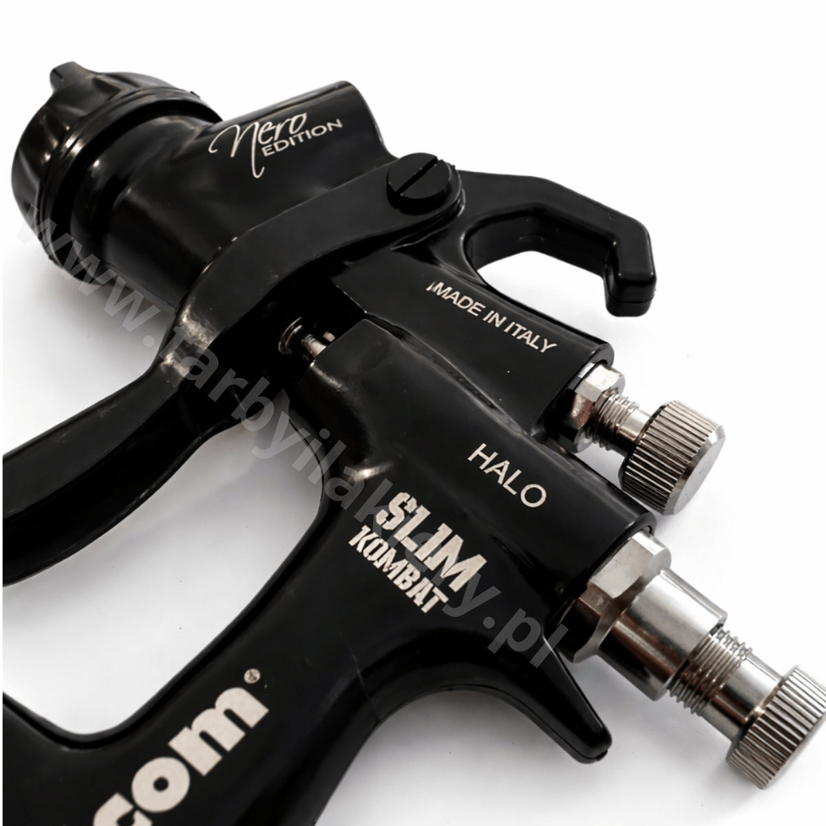 Walcom Slim Kombat HALO NERO EDITION to profesjonalny, średniociśnieniowy pistolet lakierniczy (RP / High Transfer Efficiency), zaprojektowany do precyzyjnej aplikacji bazy, lakieru bezbarwnego oraz podkładu.